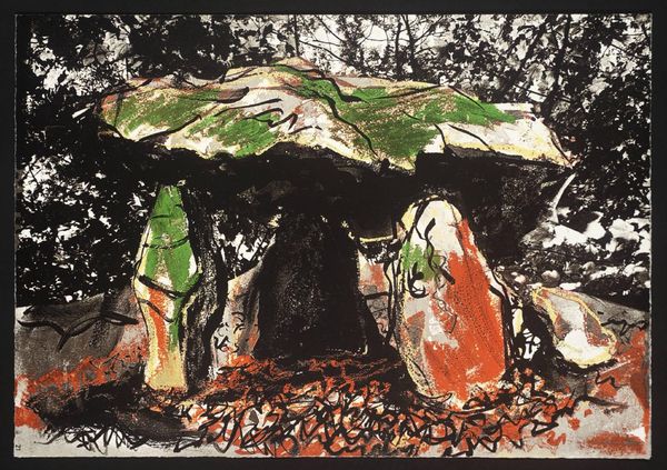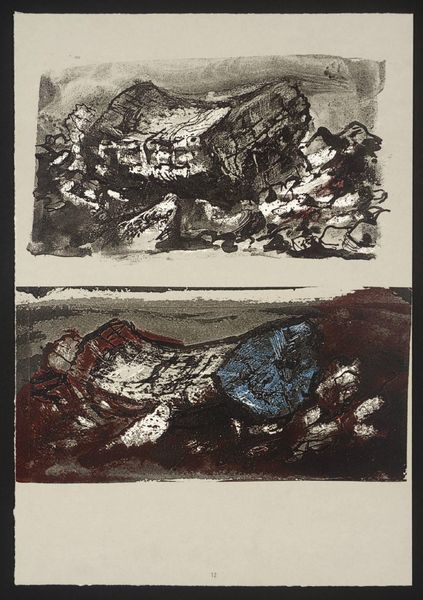 Curator: This striking, untitled lithograph is by John Piper, a British artist known for his romantic and expressive depictions of landscapes and architecture. Editor: It feels like a memory, fragmented and dreamlike. The juxtaposition of the two scenes is particularly intriguing. There is a sense of decay but also of resilience. Curator: Piper was deeply interested in the symbolic power of ruins, and their ability to connect us to the past. Here, the dark rocks below seem to represent a solid, enduring foundation, while the faded scene above hints at something more transient. Editor: I see the enduring natural formations in the bottom panel, but what about the bursts of red and gold? They add a strange element of vulnerability and perhaps even spiritual wealth. Curator: The Second World War undoubtedly influenced Piper, who chronicled devastated churches. It's possible that these images are a reflection on the landscape as a witness to history. Editor: The emotional weight of this artwork is palpable, revealing not just a physical place, but also layers of cultural and personal significance. I think I'll carry this with me.