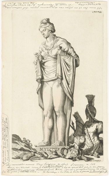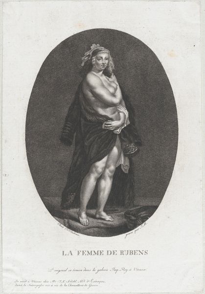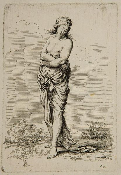 Richard Collin created this engraving of Galathea in the 17th century. The composition is dominated by the figure of Galathea herself, a semi-nude woman, whose robust form fills much of the frame, seated on what appears to be a fantastical sea creature. Collin's use of line is precise, defining form and texture. The drapery that loosely covers Galathea is rendered with close attention to its folds and shadows. The lines create a sense of depth and volume, characteristic of the Baroque interest in dynamic movement and emotional intensity. We might consider how Collin, through this mythological subject, examines the period's engagement with classical ideals of beauty and form, while also subverting traditional, static representations. Galathea embodies a powerful yet serene presence, challenging conventional interpretations of female representation. The print invites ongoing interpretations, its formal qualities prompting continued dialogue about beauty, power, and artistic expression.