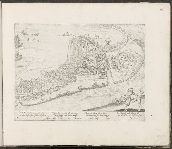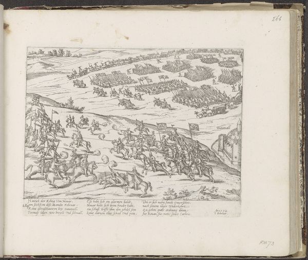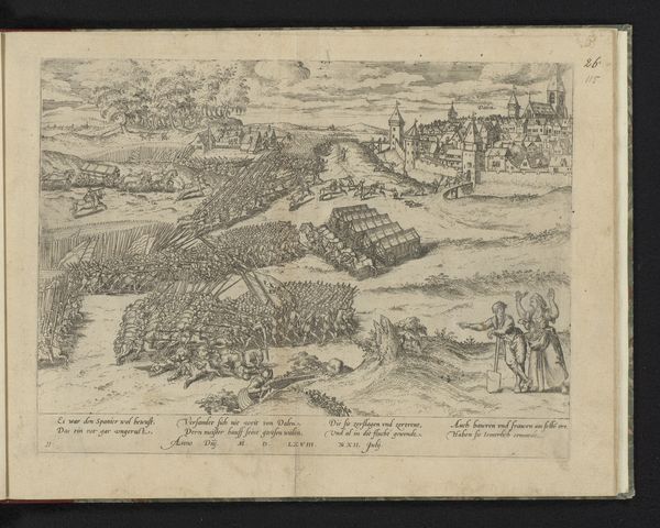 Editor: This is "Slag bij Jemmingen, 1568," or "Battle of Jemmingen, 1568," a print made by Frans Hogenberg around 1568-1570. It looks like an engraving, and it depicts quite a chaotic scene, presumably the battle. The level of detail is really striking. How do you interpret this work in the context of its time? Curator: Looking at this print, I’m immediately drawn to the way Hogenberg visualizes power and conflict within a very specific socio-political context. Consider the backdrop of the Eighty Years' War: a revolt against the Habsburg rule, deeply rooted in religious and economic grievances. Editor: Right, so this isn’t just a battle scene, but a representation of a pivotal moment in a larger struggle for Dutch independence? Curator: Precisely. The print, therefore, functions as propaganda. Who does it aim to valorize, and at whose expense? Notice the detailed depiction of the landscape versus the generalized portrayal of the bodies engaged in combat. How might that contribute to the narrative being constructed? It almost diminishes individual suffering in service of a larger territorial claim. Editor: That’s a powerful point. It’s like the land itself becomes a symbol of freedom, overshadowing the human cost of the battle. Do you think that Hogenberg’s choice of printmaking – a medium capable of mass production – reinforces this propagandistic intent? Curator: Absolutely. The accessibility of prints allowed for widespread dissemination of specific viewpoints. We need to critically examine whose perspectives were amplified and whose were silenced during this period of conflict. Thinking about issues of representation and visibility, who benefits from this retelling? Editor: This makes me see the piece in a totally new light! I was just focused on the composition. Now I recognize its embedded politics. Curator: Exactly. Analyzing art through a socio-political lens allows us to decode its layers of meaning.
