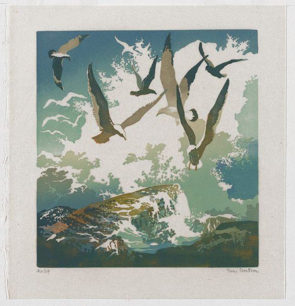 Eva Auld Watson made "Gulls and Spray" as a woodcut print, and what grabs me right away is how she uses these flat planes of color to suggest something really dynamic. It's like she’s distilled the scene down to its basic elements, and in doing so, brings a certain energy to it. You can almost feel the cool, salty spray of the waves against the rock and the air rushing under the birds' wings. It's not about photorealism, it's about the sensation of being there. The way she layers the blues and greens reminds me of Hokusai's prints, with their stylized waves and sense of movement. There’s this one bird diving right at you, and you can see the white of its head, the curve of its wing, rendered in simple, powerful shapes, which really pulls the whole composition together. Ultimately, Watson invites us to experience nature not as a static scene, but as an ongoing performance.