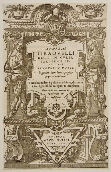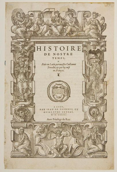Curator: This is the title border from G. Paradini’s Memoriae Nostrae, printed in Lyon in 1550. Notice the density of imagery framing the text. Editor: My first impression is one of ornate abundance. The use of line is striking; it’s so intricate, almost overwhelming, but creates a really captivating frame. Curator: Indeed. The printer, Jean de Tournes, was known for humanist texts, and this elaborate border would have signaled the book's value and erudition to potential buyers. Editor: The arrangement of figures – the putti at the top, the mythical creatures below – feels very deliberate, guiding the eye to the central text. I see how they integrate classical motifs, reflecting the Renaissance interest in antiquity. Curator: Exactly. The images draw on a classical visual vocabulary to legitimize the content within and associate it with classical wisdom. Editor: Considering the time, the craftsmanship is amazing. You can see so much detail even in the smaller characters. Curator: Absolutely. It’s a fascinating glimpse into the world of 16th-century book production and its social context. Editor: A beautiful object, showcasing the artistry involved in early printing.