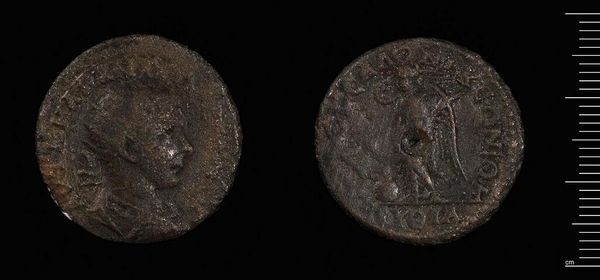 Curator: Up next, we have a Semis of Trajan Decius, currently residing in the Harvard Art Museums. Editor: There's something undeniably melancholy about its worn surface. It feels like holding a piece of lost history. Curator: The coin's very materiality—the patinated bronze, the evidence of striking and circulation—speaks volumes about its journey through time. It also challenges our notions of high and low art. Editor: I find the composition so striking; the rigid profile of the emperor, the reverse figure rendered with surprising dynamism despite the coin's diminutive scale. Curator: Indeed, the coin served as a powerful tool of imperial propaganda. Its mass production and distribution ensured that Decius' image and message reached every corner of the empire. Editor: Considering the amount of labor that went into the extraction of the metal, the minting and then circulation is really incredible. Curator: Agreed. It's fascinating to consider the cultural and political meanings encoded within its design, and the lasting power that this small object holds even today. Editor: Exactly, it is the artistry and craftsmanship that remain so compelling.