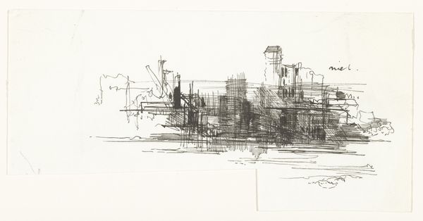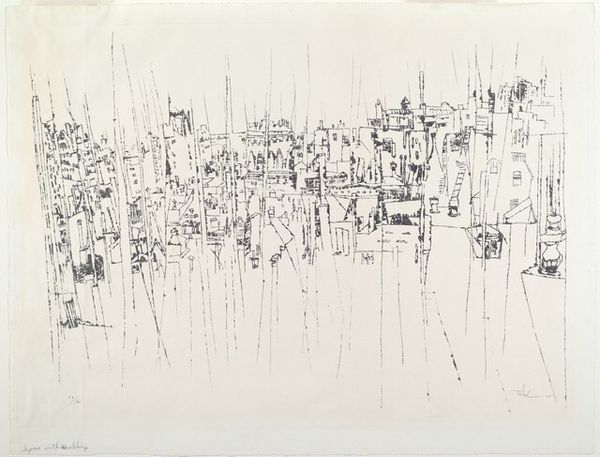 Editor: This is Peter Takal's "City Roofs" from 1956, a print that seems to be an ink drawing. It has this ephemeral quality, like a half-remembered dream of a city. What do you see in this piece? Curator: I find myself immediately drawn to the linearity and the artist's masterful manipulation of line weight. The varying thicknesses create depth and volume, suggesting forms without fully defining them. It begs us to ask questions of space and structure within the artwork itself. Note the strategic use of hatching and cross-hatching; where do they emphasize the composition's weight? Editor: I hadn't noticed the varying line weights until you pointed it out. So, you’re focusing more on the "how" of the artwork, rather than the "what?" Curator: Precisely. Consider how the artist directs our gaze through the deliberate placement of these lines. See the way they converge and diverge? Is Takal leading us towards a focal point or deliberately avoiding one? Where is the light, or absence thereof, suggested within these forms? Editor: That’s fascinating. I see it now. The lines create these subtle shadows that really give the rooftops form. But what does it *mean*? Are you suggesting it’s just about lines on paper? Curator: Meaning emerges from form. Is there a discernable system or visual rhyme established by the lines? Or a dissonance? Could that dissonance also produce an idea? How is Takal commenting on line, texture, mass and scale, just to name a few, using these basic art elements and principles? Editor: I see... So, the "meaning" isn't some hidden symbol, but something we derive from how the piece is structured. This way of analyzing art has definitely expanded my perspective. Curator: Indeed. By closely examining the formal elements, we unlock the artwork's intrinsic language. I learned new approaches to analyzing artworks through our conversation as well.