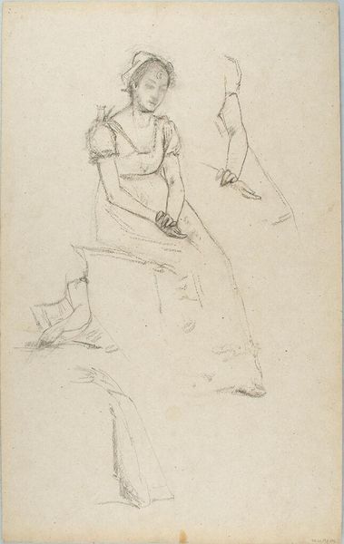 Curator: William Valentine Schevill's "Sketches of a Woman," held at the Harvard Art Museums, presents an intimate study in graphite on paper, measuring roughly 32 by 21 centimeters. Editor: It feels fragile, somehow. Like catching a fleeting thought, a glimpse of a woman caught in repose. The lines are so delicate. Curator: The sketch aesthetic certainly leans toward vulnerability. The artist captures the woman in multiple poses, perhaps exploring her inner state through outward gestures. What do you see in her stance? Editor: There’s a sense of introspection, almost resignation, in the tilt of her head and the way she loosely holds her skirt. It speaks to the historical constraints placed upon women and their roles in society. Curator: Indeed, the lack of a facial expression contributes to the sense of anonymity and universality. It could represent the many women whose stories remain untold. Editor: These sketches leave space for the viewer to project their own experiences onto her, bridging the past and present in a poignant way. Curator: Precisely, it's a work that invites contemplation, reminding us of the power of simple lines to evoke complex emotions and histories.