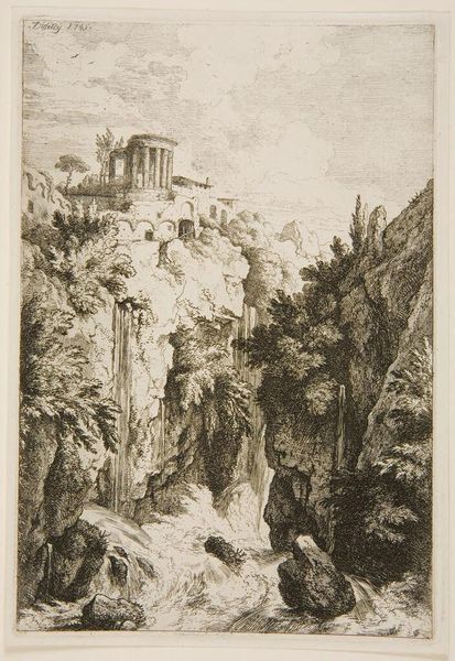 Editor: This is Albert Christoph Dies' print, "Cascata, e ponte di San Rocco a Tivoli." It captures a scene in Italy, featuring a bridge and waterfall. I'm struck by the precision of the lines and the contrast between the built environment and the natural landscape. What stands out to you? Curator: I focus on the etching process itself. The labor involved in creating this detailed image, transferring the scene onto a metal plate, and then printing it for wider consumption, speaks volumes about the art market of the time and the value placed on these views. Editor: So, you're interested in the mechanics and the economic aspects? Curator: Precisely. Consider the social context: who commissioned this? Who could afford such prints? It reveals a lot about class and access to art. Editor: I never thought about it that way! The print becomes less about the waterfall and more about the process and the people behind it. Curator: Exactly, and the consumption of idealized landscapes by a particular social group. Editor: That's given me a whole new perspective to consider when looking at art!