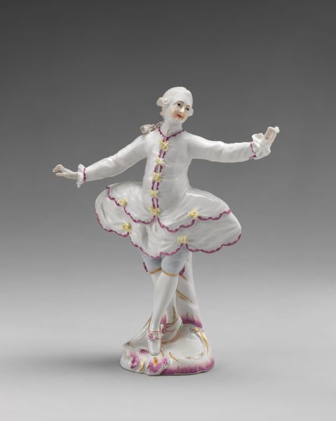 Editor: So, this delicate porcelain sculpture, "Street Seller," created around 1765 by the Derby Porcelain Manufactory, is just lovely! It feels very...frivolous, in a way. The details are exquisite, especially the lamb and the little basket of fruit. How do you interpret this kind of object in its historical context? Curator: It’s fascinating to consider its role. This wasn’t merely decorative; it communicated social values and aspirations. The Rococo style, with its emphasis on ornamentation and playful themes, catered to the aristocracy. Who do you think was the likely owner of such piece, and what values would such object promote? Editor: Someone wealthy, for sure, probably trying to project an image of pastoral innocence, maybe? Despite, likely, benefiting from serious social inequalities. Curator: Exactly! These porcelain figures reflected and reinforced class structures. By showcasing idealized scenes of everyday life, they masked the harsh realities faced by ordinary people. Think about it: a street seller represented in delicate porcelain—it's a romanticized vision, divorced from the actual labor and economic hardship. It reinforces a sort of passive consumption on the part of the beholder, an elite consumer in its day. Editor: That makes a lot of sense. It’s almost like propaganda, reinforcing a particular worldview through art. Curator: Precisely. It shows us how art can be used to maintain social hierarchies and shape perceptions. The museum itself participates in these functions when placing the work for the public to consume. Editor: I’ll definitely think differently about decorative arts after this! I had underestimated its role in shaping society's views. Curator: It's always valuable to remember that what appears beautiful or harmless can have complex socio-political underpinnings.