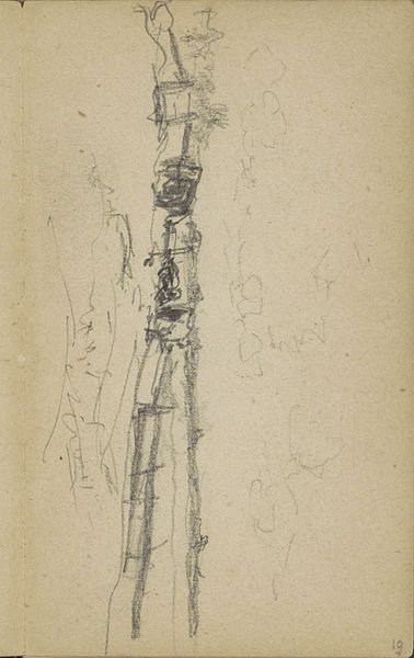 Curator: This is George Hendrik Breitner's "Landschap met bebouwing en figuren, mogelijk in de buurt van het Rustenburgerpad te Amsterdam," created in 1907. It’s a landscape drawing held here at the Rijksmuseum. Editor: Immediately, it strikes me as ephemeral—like catching a fleeting moment. The stark lines and muted tones evoke a kind of hazy industrial memory, a world almost forgotten. Curator: Precisely! It's rendered in pencil and ink on toned paper. You can see the quick, almost frantic energy of the lines—the artist capturing the essence of a place on the go. I wonder what that building even was? Editor: Considering Breitner's social consciousness, it likely represents urban development and industry's encroaching presence in Amsterdam. Think about the laborers who likely toiled to build and work within those spaces, all while their surroundings were rendered onto aged paper using mass-produced pencils. It points to an emerging mass culture too. Curator: Yes, you get that feeling. It makes me think about the Romanticists too. Here, Breitner’s almost trying to find beauty in the grittiness of the modernizing city, an antidote to more polished academic art. Perhaps capturing what industry hides: what workers see everyday on the Rustenburgerpad. Editor: It begs the question of who "art" is even for? Why elevate this industrial subject to a gallery, and for whom? Breitner isn't trying to flatter with pleasant images. He's trying to provoke a consciousness, which requires active observation to deconstruct our complicity within the society’s material systems. Curator: Perhaps, yes. And looking at how minimal it is, it gives a sense of intimacy. We're given access to Breitner’s immediate perception; we become witnesses alongside the artist as he records these fleeting realities, using just pen, paper, and his artist eye. Editor: Even the support, the aged and toned paper—it isn't just a neutral surface. The paper signifies value or an inherent cost: paper production demands resources like wood, water and labor. Was this choice an active response or merely utilitarian for preliminary fieldwork studies? The way those materials were sourced informs our understanding of it. Curator: What a lovely notion: to imbue such an apparently simple drawing with layers of context, from its materials to its subject matter and message. It makes you look anew, doesn’t it? Editor: Definitely. It challenges how we consume both art and everyday life.