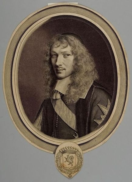 Curator: This is Robert Nanteuil's portrait of Henri II de Savoie, Duc de Nemours. I'm struck by the intensity captured in what appears to be a deceptively simple engraving. Editor: Simple? I see a cascade of signifiers. It's a carefully constructed image of power and status during the era of absolutism. The Duke's pose is so mannered! Curator: True, but the eyes… there's a melancholy that goes beyond mere presentation. Perhaps a hint of the conflicts within. The cross around his neck feels almost like a weight. Editor: Absolutely. Consider the context: religious conflict, social hierarchy rigidly enforced. This portrait performs an identity—a noble one, of course—but it also reveals the constraints. Curator: A performance indeed, but one that suggests a human being lurking beneath the surface, wrestling with his place. Editor: Yes, those eyes hint at a consciousness aware of its own gilded cage. It makes me wonder about the unrecorded stories within that history. Curator: The beauty of art—it captures both the seen and unseen, the stated and unsaid. Editor: Precisely, and that tension is where true understanding begins.