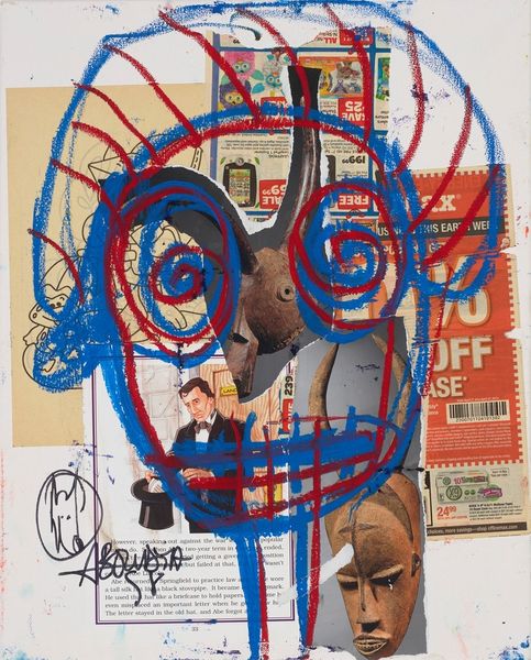 Curator: This striking collage, made with mixed media in 1938, is titled "Political collage" and created by Karl Wiener. The use of repurposed printed fragments makes quite an immediate impression. Editor: Yes, it does. My first thought is: chaos. The image is almost aggressively dense, packed with fragmented text and faces. The colours are muted overall, but those geometric shapes on the central skull pull your eye right in. It feels tense. Curator: The tension is definitely intended. The work deploys surrealist and expressionist techniques, particularly in the disjointed juxtaposition of images, to speak to the tumultuous political climate. Considering the looming threat of World War II, the choice of source material becomes quite pointed. Editor: Precisely. All these snippets of newspaper clippings, you can see the years '37, '38... bits about 'communism', 'Spain', along with visual cues to rising fascism. It’s a direct commentary on the materials used to construct narratives, especially within cityscapes undergoing these massive ideological shifts. Look how labour and political unrest manifest within the composition. Curator: Wiener employs art deco geometric stylization on figures alongside stark portraiture and caricature. It speaks to identity construction amid nationalistic fervor, raising questions around the human cost of ideological clashes through a modern lens. This is very evident in the depiction of a skeleton. It highlights the pervasiveness of death. Editor: Indeed, but more subtly than just the inclusion of death. The 'making' of it, the physical assembly—it mirrors how identities, especially national identity, are actively manufactured and consumed. Notice the different paper quality used. Wiener brings forward the economic conditions of newspaper production at this time. There are elements of the readymade there as well, shifting attention towards the social life of the work as a material object. Curator: Considering its themes, do you think "Political collage" achieves relevance in a contemporary dialogue about constructed social realities? Editor: Absolutely. By bringing materiality to the forefront, Wiener prompts us to consider labor. Furthermore, the politics, and economics of representation itself – which is a crucial message still today. Curator: A powerful collision of form and function that compels ongoing critical engagement.