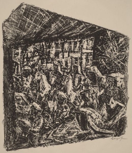 Editor: This is Leon Kossoff's "The Rape of the Sabines (2)." The frantic lines and tangled figures make it feel really chaotic. What's your take on its historical context, especially given the title? Curator: Kossoff's work invites us to consider how historical narratives are constantly re-interpreted. This isn’t a straightforward illustration of the Roman myth. How does the abstraction and roughness of Kossoff's style affect your understanding of violence and power in historical depictions? Editor: I guess it makes it feel more immediate, less like a romanticized story. More like…a raw, real struggle? Curator: Precisely. It's a modern lens on an ancient tale, revealing the ongoing complexities of gender, power, and conflict as viewed through a contemporary sensibility and its relation to museum culture. Editor: It’s amazing how much history and social commentary can be packed into what at first seems like just a messy drawing. Curator: Indeed, this piece reflects how art institutions shape and are shaped by socio-political forces.