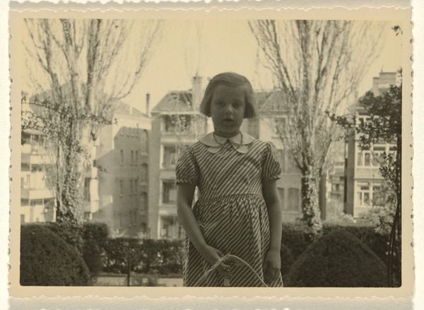 Curator: The somber mood really strikes me here. Even with the idyllic setting of what appears to be a sunny terrace, there is a definite sense of gravity, almost unease. Editor: Indeed. The photograph you are observing, a gelatin-silver print made between 1935 and 1938, is entitled "Isabel Wachenheimer eet een perzik op een ligstoel op een terras in Engelberg, augustus 1935," or, "Isabel Wachenheimer eating a peach in a deckchair on a terrace in Engelberg, August 1935." Curator: Thank you, yes, Isabel's placid pose in a deckchair disrupts any straightforward interpretation. Considering the time it was taken, are we perhaps invited to ponder ideas around privilege, mobility and childhood in the face of encroaching fascism in Europe? Her nonchalant act of enjoying a simple peach seems laden with the anxieties of an uncertain era. Editor: That contrast is precisely what I find compelling here, that almost crystalline sense of light and shadow in rendering textures and surfaces, from the young girl's dress, and the hexagonal terrace, to the dense foliage in the background. The geometry and stark tonal shifts speak volumes in their visual order. Curator: Right. Let's think about the young girl for a moment. Children are not apolitical; rather, childhood becomes another space in which social and political tensions play out. Even the act of taking this photograph positions this child within a particular framework. Editor: And speaking of the framework, let's consider how the formal qualities of this artwork lend it meaning. The somewhat off-center composition creates an active tension; the dark and light playing out on the girl, set against the verdant dark of foliage beyond a metal railing, sets up a compelling dichotomy between the terrace idyll and what may lie beyond. The photographer directs our focus to these shapes. Curator: Exactly, but consider the context – photographs are never neutral documents of history; instead, they function as powerful reminders that the everyday, the banal, can be intensely political, and even perilous. This ordinary moment then transforms into an eloquent commentary on an extraordinarily unsettling period. Editor: Well put. It goes to show how a seemingly straightforward portrait can reveal layers of aesthetic sophistication and deeper meaning if you really examine its construction. Curator: Absolutely; these stark portraits allow us to view children with greater analytical rigour; we begin to realize that, far from innocent bystanders, they, too, navigate the ebbs and flows of global crises, and this photo reveals it with uncanny directness.