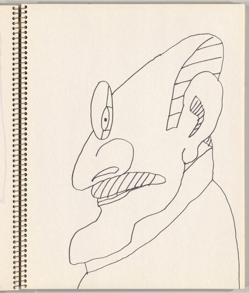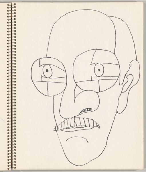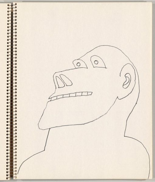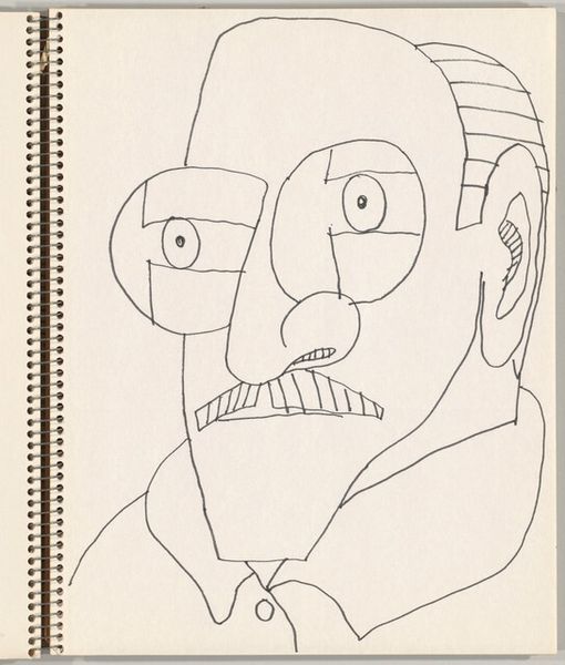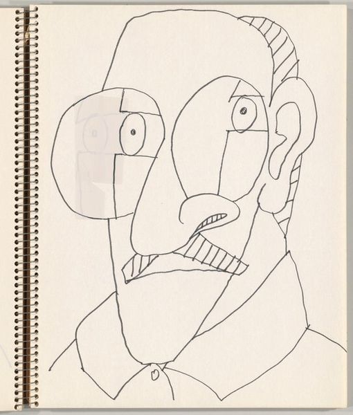 Editor: This is Saul Steinberg's "Self-Portrait" from the 1980s. It's an ink drawing on what appears to be a page torn from a spiral-bound sketchbook. The bold lines create a humorous and somewhat unsettling caricature. What strikes you about it? Curator: As a materialist, what grabs me is the evidence of process – the visible ink, the notebook paper, the casual, almost disposable nature of the support. Consider the economic realities here: inexpensive materials, easily accessible. It democratizes artmaking, doesn’t it? Editor: It definitely feels accessible. Almost anyone could pick up a pen and paper and try something similar. Does that diminish its artistic value at all? Curator: Not at all! Instead, it highlights the conceptual choices Steinberg made. He wasn't striving for photorealism or classical beauty. The deliberate crudeness, the emphasis on line…it forces us to consider the very act of representation, the labour of creating an image, and the materiality of thought itself. Editor: So, you're saying the materials themselves become part of the meaning? Curator: Absolutely. The mass-produced paper, the simple pen, they are indicative of their time and of the accessibility of art materials, pointing towards a cultural shift away from purely academic art. It becomes about the *doing*, the mark-making, the conceptual framework more than the preciousness of the materials. What assumptions are challenged here by it seeming almost…unfinished? Editor: I hadn't considered the challenging aspect. I initially saw it as simple, but I see now how the simplicity pushes back against traditional notions of artistic skill. Curator: Precisely! And within the constraints of these readily available materials, Steinberg carved out his own distinctive, influential artistic space. The mundane becomes profound, elevated through intention. Editor: This has totally changed how I view this piece! Thanks! Curator: Likewise, it’s useful to reassess how even rudimentary methods are capable of reflecting society.