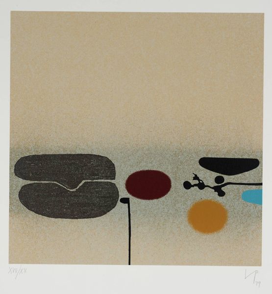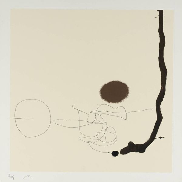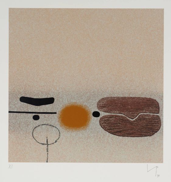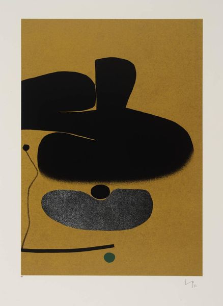 Editor: Here we have Victor Pasmore’s “Points of Contact No. 24”. The stark contrast between the textured background and the bold, black shapes is really striking. What do you see in this piece? Curator: The rough texture of the ground evokes the industrial processes of its making. The black shapes, seemingly random, are deliberately placed, mimicking the fragmentation of labor in post-war production. Editor: So, the materials themselves are as important as the image they create? Curator: Precisely. The means of production and the physical qualities of the materials comment on the changing social and economic landscape. How do you think that relates to Pasmore's other works? Editor: I hadn't considered that. It adds a whole new layer to my understanding. Curator: Indeed, and now we both see it differently.