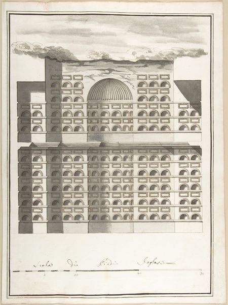 Curator: This is Pietro Paolo Coccetti’s "Elevation of a Columbarium," a drawing likely created between 1710 and 1727. The piece resides at the Metropolitan Museum of Art. What strikes you first about it? Editor: The immediate impression is one of relentless order. The repetition of the niches, the almost mathematical precision, feels…oppressive in a strange way. Curator: Oppressive how? The form, its sheer repetition, is quite remarkable, but how does that relate to its likely purpose or the social contexts of columbariums? Editor: Consider the repetitive labor involved in producing such a detailed drawing. Coccetti employs pen and brown ink, focusing on linear precision, the formal architecture takes center stage; this suggests that this piece was intended to present an architectural design to potential patrons. It demonstrates expertise in drafting and design which was a service available on the market. Curator: Precisely. So, less about death then, and more about… market exchange? The consumption of skilled labor? Editor: It highlights a commodified afterlife. Each niche represents a purchase, a space within this rigidly organized structure. The visual language speaks of societal stratification, the ordered arrangements, as much as it evokes feelings about mortality. Curator: But doesn’t the line work itself convey something? Coccetti's hand, moving across the paper, creating each individual cell…that's where the labor and the artistry become inextricably linked. Each line signifies the making of the afterlife for those who could afford it. Editor: A vital point! Looking again, I’m drawn to the composition’s delicate balance. It's not merely a cold architectural plan; there’s a sensitivity in the line work that elevates it, transcends the piece’s explicit goal to memorialize. There is beauty in the precision of design. Curator: Absolutely. By analyzing it we recognize a convergence between function and form, connecting historical context with the immediate visual experience. Editor: Indeed, we move from funerary design to consider notions about labor, class, and, ultimately, the human urge to control and commemorate, rendered with grace and rigor.