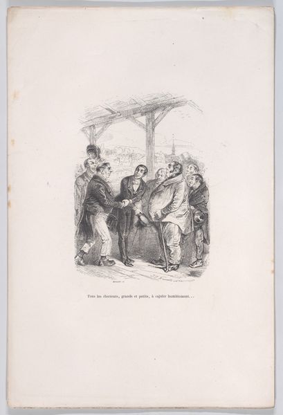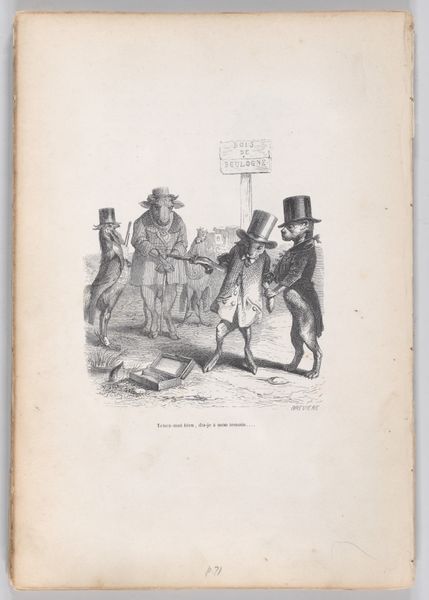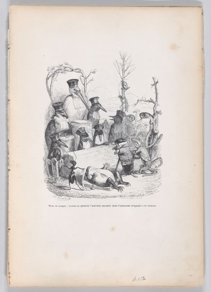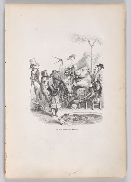 Editor: This is "This protest was stifled by the noise of private conversations" from *Scenes from the Private and Public Life of Animals*, an engraving made by J. J. Grandville between 1832 and 1852. It looks like a political cartoon, with animals acting as stand-ins for people. What social commentary do you think Grandville was making here? Curator: The choice of animals is central. Grandville uses them to satirize human behavior, highlighting our follies and societal structures. Note how certain animals, perhaps the bears and the giraffe, are placed in positions of seeming authority or elevated status. What power dynamics does that bring to mind? Editor: Maybe he’s critiquing the upper class? Those animals do look pretty disinterested in the "protest" happening. It makes me think of how those in power often ignore the pleas of the marginalized. Curator: Precisely! And look closer at the title, consider it in the context of the social and political upheavals of 19th-century France. Revolutions, censorship, and the suppression of public discourse were all too common. How does that added knowledge influence your view? Editor: Knowing that, the "private conversations" silencing the protest become more sinister, maybe a critique of those in power suppressing dissent behind closed doors. Curator: Absolutely. Grandville wasn’t just drawing funny animals; he was engaging with crucial issues of his time: the silencing of voices, the illusion of freedom, and the ever-present struggle for social justice. This wasn't simply about animals but about challenging the viewers to critically examine the world around them. Editor: That’s a powerful way to use art for social commentary! I hadn't fully considered the weight of the historical context. Curator: Understanding that context unlocks so many layers. Grandville uses visual satire as a tool to examine contemporary events from a fresh, urgent perspective. Editor: I’ll definitely remember to think about these kinds of critical elements more next time. Thanks for your help!