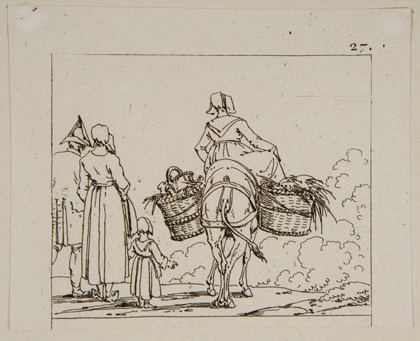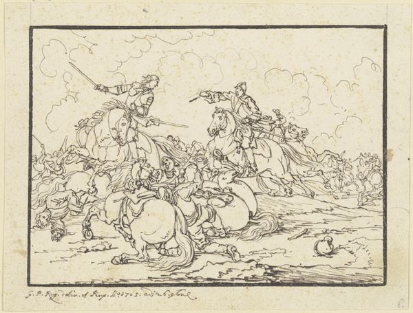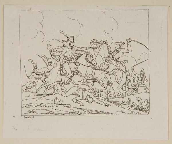 Editor: This is "Plate VIII" by Jacques-Francois-Joseph Swebach from the Harvard Art Museums. It looks like an ink drawing of a cavalry battle. The composition is so dynamic, chaotic even. What do you see in this piece? Curator: Indeed. Note the use of line. Observe how its variations—thickness, direction, and density—articulate form and convey movement. Is there a structural tension between the foreground and background elements? Editor: I notice the foreground figures are much more detailed than the background, creating a sense of depth, but could it also convey the chaos of war? Curator: Precisely. The artist masterfully employs line to suggest not only depth and form but also emotional intensity. What does the uniformity of line say about the artist's perspective? Editor: It’s interesting how much energy is captured in such a simple medium. Thank you for guiding me through this formal analysis. Curator: My pleasure. The essence of art often lies in its intrinsic elements.
