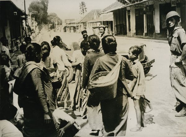 Editor: This is "Peru, page 27," a 1948 photograph by Robert Frank, a gelatin silver print. It has such a stark, documentary feel to it. You've got these children sitting on a hard ground looking up at these soldiers in formation, and the composition emphasizes the power dynamic. What do you see in it? Curator: I see a critical snapshot of post-war societal structures. Frank often explored how power operates within social contexts. Think about how the image is framed. We, like the children, are placed below, looking up at a seemingly endless line of soldiers. This perspective invites us to consider the institutional authority represented by the military, particularly in the shadow of global conflict and the rise of increasingly militarized governments. Editor: It makes me think about the role of photography itself, whether it can truly be objective. Is Frank making a statement, or just showing what was there? Curator: That's a crucial question! Consider that Frank's later work, especially "The Americans," was highly controversial because it challenged idealized images of American life. "Peru, page 27," could be seen as an early step in that direction. The very act of choosing this perspective, focusing on the children’s gaze, positions the viewer to question the normalized image of military might and its potential impact on the vulnerable. Does the visual language feel neutral to you, or charged? Editor: Charged. Definitely charged. It seems like the placement of the children isn't accidental. Curator: Exactly. The socio-political climate shapes artistic intention, and, reciprocally, art can reveal hidden social structures. I wonder what the Peruvian people felt at that time with their government… Editor: That's given me a lot to think about! It’s interesting how this photo becomes more complex once you start to dig into the context around it. Curator: Absolutely. It demonstrates the power of images to embody both a moment and the historical forces at play.