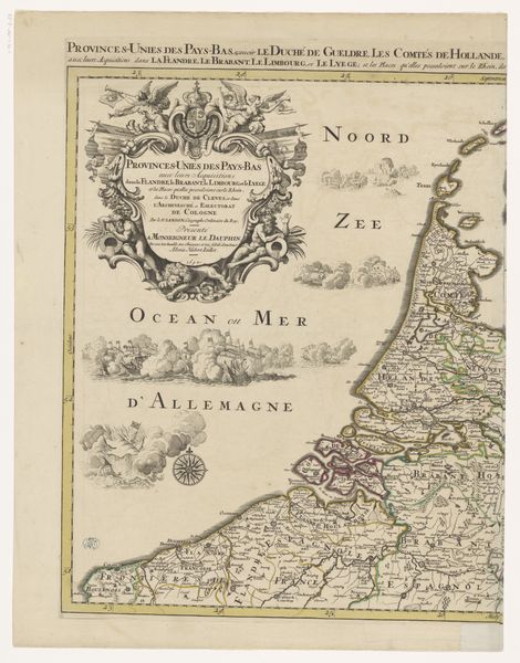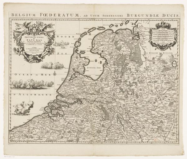 Curator: What a fantastically detailed engraving. This is "Kaart van het graafschap Holland," or "Map of the County of Holland," dating from between 1611 and 1614, created by an anonymous artist. It’s an exquisite example of early Dutch cartography. Editor: It certainly is intricate! The dense network of lines creates a very textured surface, almost a fabric. The script, too, has such a calligraphic quality; its loops and flourishes add an elegance to the document. Curator: Absolutely. During this period, the Dutch Golden Age was in full swing, and maps like this were not only navigational tools, they were symbols of status and power. Possessing detailed knowledge of the land, especially during a time of immense trade and territorial expansion, meant control. The precision of this piece reflects the rising importance of empirical observation and scientific accuracy in Dutch society. Editor: Looking closely, I am fascinated by the tension between the overall geometric grid and the organic, meandering coastlines. Notice how the waterways carve their way into the land, creating complex, almost fractal patterns? This contrast is visually very compelling, drawing the eye into a dance between order and nature. Curator: Indeed. These maps served as a crucial record of geographic and political landscapes for a burgeoning merchant class, facilitating trade routes and asserting Dutch claims over newly acquired territories. And if you observe how “Mare Germanicum” sprawls across the top left, you will also notice how they would subtly indicate who was thought to possess control of which seas. Editor: And also notice the way the cartographer handles scale. It seems less about absolute accuracy and more about presenting information, privileging the symbolic representation of key landmarks and urban centres. Curator: That is spot on. These maps not only show us the physical geography of the land, they narrate the rise of Dutch power, prosperity, and intellectual prowess during one of its most pivotal historical moments. Editor: I am just still admiring the balanced distribution of tonal values here, ranging from dark, densely engraved areas to the pristine, untouched paper. Curator: Yes, quite the synthesis of artistic vision and a societal projection of territorial awareness and aspirations. Editor: Well, it has certainly given me a greater sense of the integration of cartography and social ambition.