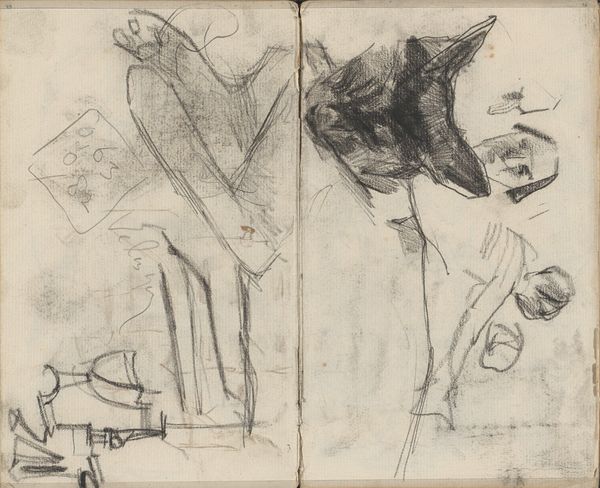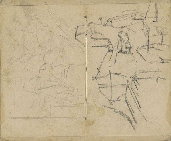 Curator: This drawing by George Hendrik Breitner, titled "Studieblad met paarden en figuren," or "Study Sheet with Horses and Figures," dates from between 1883 and 1885. Created using pencil on paper, it now resides at the Rijksmuseum. Editor: Immediately, I am struck by how unrefined it is—very raw. It's not just a depiction of horses and people; it feels more like an intimate glimpse into an artist's process. Curator: Precisely. Breitner's mark-making here captures movement and form with such directness, foregoing perfection. This speaks to the wider context of his commitment to realism, where he turned towards documenting modern city life and daily life. Editor: There is also an unmistakable class dynamic that is evident: figures with what looks to be military or work uniforms positioned beneath or subservient to the horses which immediately places the work into historical structures and narratives concerning power. What's fascinating is that while appearing almost fleeting in nature, Breitner nonetheless engages these social issues through visual language alone. Curator: Breitner developed a fascination with the psychological impact of fleeting impressions in this time. One cannot dismiss that Breitner returned frequently to horses and military personnel as a central subject that served as more than mere objective renderings. Their visual recurrence also served deeper internal registers. Editor: Agreed. Also, I find it interesting to examine how Breitner uses the physical support - here paper and pencil. Note how the unfinished character of drawings makes a case for valuing sketches as carriers of cultural and political messaging instead of simple observational studies alone, which I am sure the artist struggled against to achieve autonomy and recognition. Curator: A fair point indeed. Breitner may capture what he observes around him with accuracy while drawing and at the same time is building personal worlds charged emotionally on his paper's surfaces! I now regard the drawing as much more than mere realist depiction; rather it showcases social observations interwoven tightly together across generations via recurring images found within individual psyches Editor: What seemed initially an impulsive sketch really becomes far more meaningful with layered interpretations concerning history and perception interwoven together brilliantly by Breitner through horses that reappear across decades within personal artistic creations... a powerful example, indeed, of his brilliance.