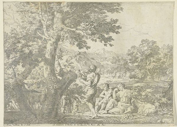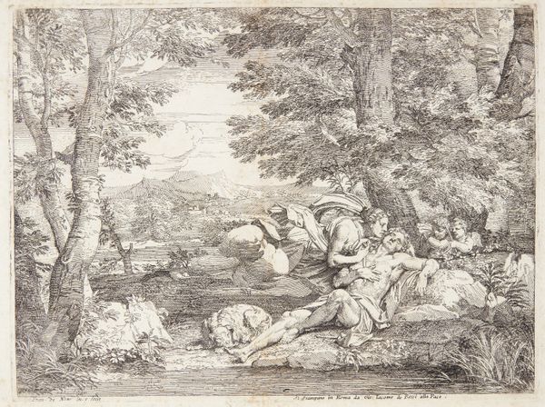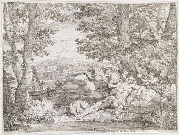 Franciscus de Neve created this etching entitled "Diana en Endymion". The composition is dominated by a dense and intricate use of line to create a scene rich with texture. The foreground is detailed with foliage, leading the eye to the central figures, Diana and Endymion, amidst a forest setting. The interplay of light and shadow, achieved through varied densities of etched lines, gives the work a dynamic feel. The figures' repose contrasts with the active, textured background, drawing focus to their intimate moment. De Neve's formal choices, particularly in his use of line, engage with philosophical ideas about perception and representation. The visual language of the etching, employing the signs of classical mythology, would have resonated with contemporary viewers, creating a network of meaning through shared cultural codes. The etched lines invite ongoing interpretation, as each viewer brings their own context to understanding the work's cultural and philosophical resonances.