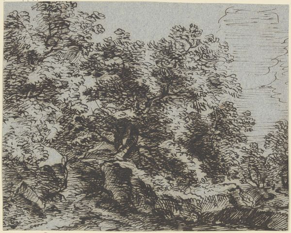 Editor: This is "Hilly Landscape with Town in Distance" by Agostino Carracci, and it's currently held at The Art Institute of Chicago. The work employs chalk, ink, and pencil on paper. There's a quiet stillness in the scene despite the detail. What aspects of this landscape strike you most? Curator: Note the strategic employment of line, Editor. Observe how the density and pressure of Carracci’s marks articulate volume and recession, from the foreground’s sharply defined hillocks to the subtly rendered town in the distance. Do you see how line directs our gaze? Editor: Yes, the use of hatching really creates depth. But what about the overall structure, beyond just the lines themselves? Curator: Precisely! Consider the compositional structure. A foreground dominated by shadow contrasts with the light-filled middle ground, where the city sits. Then there's a fading into the background. This interplay of light and shadow creates spatial dynamics, a tension that’s visually compelling. It leads the viewer's eye to the center of the piece, where the architecture and distant background come into focus. Editor: It’s like a visual path! The more I look at it, the more intricate it becomes. Curator: And consider the use of materials! The combination of chalk, ink, and pencil—each has its own inherent textural qualities. It makes this more than just a representation; it becomes an investigation into the very nature of mark-making. Editor: I see now how his choices create visual interest in the formal composition and use of line and space! Curator: Indeed. By attending to these formal elements, we unlock a deeper understanding of Carracci’s artistic intentions. Editor: It's amazing how much you can see just by looking closely at the formal elements!
