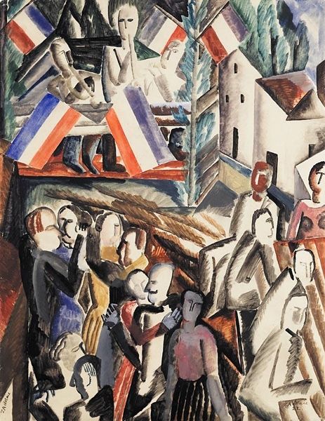 Editor: This is Grace Cossington Smith's "Reinforcements: Troops Marching," painted in 1917 using oil paint. The colours are unexpectedly cheerful, almost celebratory, for a painting made during the First World War. What do you see in it, viewed through a historical lens? Curator: The painting offers an intriguing perspective on the public image of war. Notice how Cossington Smith doesn’t focus on the battlefield. Instead, she presents a scene of public support and mobilization. Consider the social pressure at the time to conform and support the war effort. Do you think the artist is perhaps subtly commenting on this enforced patriotism through the bright colours? Editor: That's a great point. I hadn't considered the social context quite that deeply. The naivete and bright colours could actually highlight the pressure to see the war as a glorious thing, even if the reality was quite different. I'm struck by how the flags and the marching soldiers are almost like a pattern repeated. Curator: Exactly. The repeated imagery, almost like a propaganda poster, hints at the institutional promotion of war. Think about the role of the state in shaping public opinion. The artist offers this very personal viewpoint against the march, not only of soldiers but the inexorable force of cultural norms. What do you feel is missing, visually or conceptually? Editor: I'm missing the sense of fear or loss that I'd expect. Now I realize its absence speaks volumes. I wonder if Cossington Smith was making a conscious statement about the role of art itself in either promoting or questioning societal narratives? Curator: Precisely! It’s in these subtle visual choices, these absences, that the artist’s perspective and the socio-political dynamics of the time reveal themselves. Understanding these factors adds another dimension to experiencing this painting. Editor: This discussion really changed how I perceive the artwork. I see now the complexity hidden within such a seemingly straightforward image. Curator: And hopefully it demonstrates how historical context is critical in our perception of visual art, to reveal the messages in a work of art that go far beyond its literal subject matter.