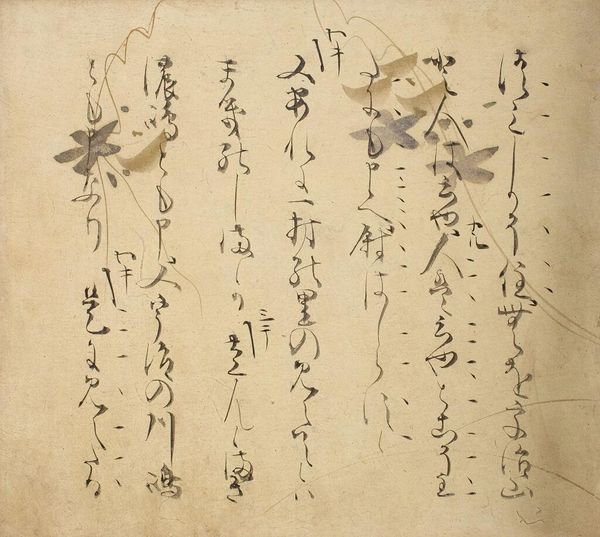 Editor: This is a page from "Five NÅ Plays," attributed to Hon'ami KÅetsu, from the 16th or 17th century. The brushstrokes are so delicate. What can you tell me about its creation and context? Curator: Consider the paper itself, the ink, the brush. The materials speak to a culture that valued refined tools and skilled labor. The act of writing these plays was a performance in itself, a careful dance of hand and mind. How does the materiality inform your understanding of the play’s content? Editor: I guess I hadn't thought about the labor involved in creating the paper and ink. Curator: Exactly. And how might the consumption of such an artwork have reflected social status or cultural values? It's more than just ink on paper; it's a record of production and consumption. Editor: That's fascinating. I'll never look at calligraphy the same way again.