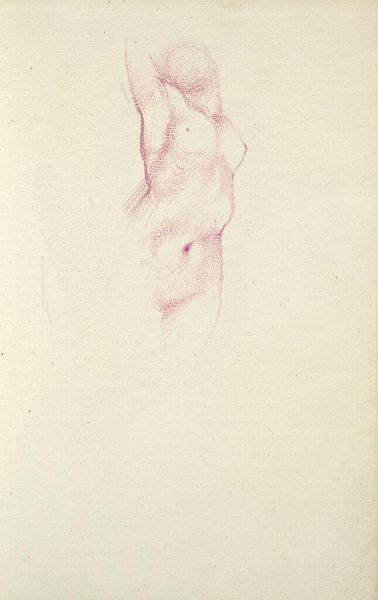 Editor: This is a study of a left leg by Edward Burne-Jones, likely created in preparation for his painting, "The Tree of Forgiveness." The delicate rendering in sanguine chalk gives it a softness I wouldn't expect in a life study. What do you see in it? Curator: It's a glimpse behind the curtain, isn't it? Like catching an artist murmuring to themselves. The red chalk feels so immediate, so human. I wonder what Burne-Jones was thinking about as he worked through these anatomical details. Was he striving for perfection, or something more… expressive? Editor: Expressive, definitely! It's not just anatomy; it's a leg brimming with latent energy. Curator: Exactly! It's about potential, about the story this leg could tell if it were set in motion. It’s funny how a fragment can feel so complete. Editor: I hadn't thought of it that way – a complete fragment. Thanks! Curator: My pleasure. It's all about how these fragments spark our own imagination, isn't it?
