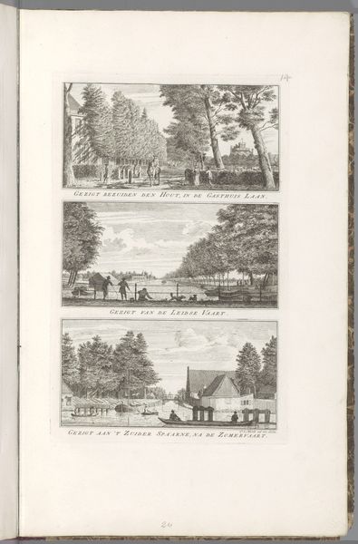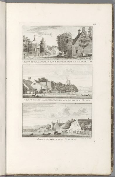 Curator: Here we have "Gezichten op landschappen bij Overveen en Bloemendaal," or "Views of Landscapes near Overveen and Bloemendaal" created in 1763 by Cornelis van Noorde. This piece from the Rijksmuseum is an etching, engraving, and print all in one. Editor: My first impression is of order. A series of landscapes stacked neatly on the page, a bit like pressed botanical samples or surveying documents, each captured with meticulous detail. Curator: Right, let's consider that meticulous detail. Van Noorde was a draughtsman, etcher, and engraver, focusing primarily on topographical representations. He documents these locations around Overveen with sharp detail, almost clinical in its exactitude. What social forces might shape such work? Editor: The rise of the middle class, for starters. They needed affordable art for their homes, art that reflected their world. Prints made that possible, democratizing art consumption in a way previously unheard of. Consider the labour; one plate, multiple impressions, spread across a widening marketplace. Curator: Precisely! The print becomes a commodity. But also consider the emerging scientific impulse; to classify and document the natural world. This resonates with the broader context of the Enlightenment and the evolving public role of artists as observers of the everyday world. Editor: Absolutely. Each etching seems deliberately chosen to project images of productivity. Fields and paths suggest agriculture. Also, the lines etched in the copperplate dictate not only perspective but also the perceived textures of the landscape. Curator: It brings up interesting considerations around artistic labour itself, doesn't it? Van Noorde clearly prioritized capturing recognizable representations. Did he regard this as simply a craft, or were there artistic intentions present as well? Editor: He had to possess great technical skill. The act of engraving is, in itself, highly skilled manual work. Yet, it raises a wider social question. In an age of canals and trade, could we understand this landscape through material flows? The barges going up the Jan Gijzenvaart carrying goods. Curator: Indeed. Each small rendering becomes evidence of broader shifts within society itself, doesn’t it? Editor: Reflecting upon that, it appears this etching isn't just a pretty view, it shows social movement, processes, and people that relied upon these land for survival and recreation. Curator: Well, it has given me plenty to think about in terms of art patronage and public engagement back in the late eighteenth century. Thank you.
