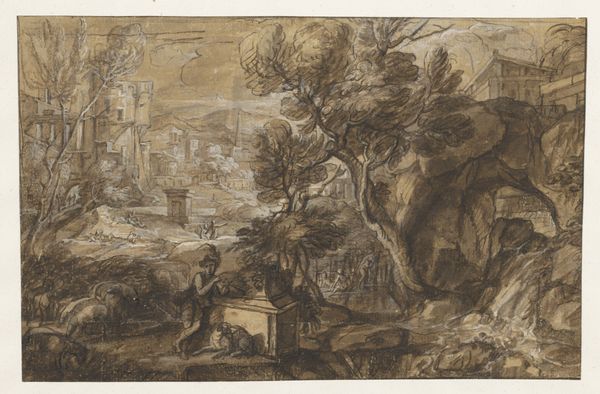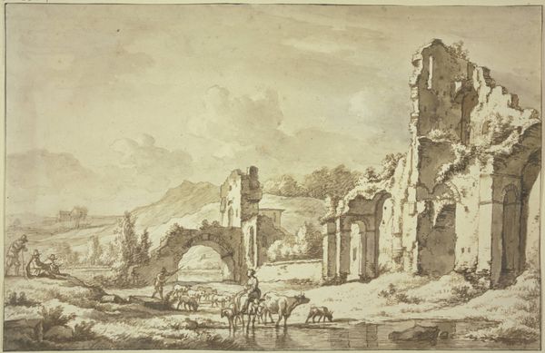 Curator: Hendrick van Minderhout gives us "The Gate of Bruges at Sluis" from 1661, currently held at the Metropolitan Museum of Art. It’s pen and ink on paper. Editor: My immediate feeling is melancholy. There's a beautiful decay to it, this quiet crumbling of structures – and then these tiny figures just casually perched amongst it all. Are they simply witnessing, like us? Curator: Indeed. Consider the social implications of depicting this scene in the Dutch Golden Age. Sluis was a strategic port; representing its infrastructure, even in decline, spoke to broader shifts in trade routes and naval power. The very act of committing ink to paper meant navigating a complex market for art materials—the paper itself having passed through various merchant hands before ever reaching Minderhout. Editor: I get that on one level, the economic network underpinning art creation… but look at the almost whimsical lines he uses. The loose hatching gives texture to the stone, makes you feel the weight of those arches, or that slightly listing tower in the distance. It's so tactile. It almost makes me nostalgic for something I've never known! Curator: Right. Tactility underscores the interaction of the laborer, of Minderhout himself as he bends over the paper, engaging with the materials to generate an image circulated through other exchanges… These are sites once bustling hubs of maritime commerce; the decay evident speaks not just of aesthetic choice, but societal shifts. It serves as a subtle commentary on the ephemeral nature of power and the relentless march of time, even amidst economic boom. Editor: Time certainly holds all things ransom! I also see the figures grouped as if frozen in contemplation. I wonder what narratives they construct amidst these aging walls? Is it solace, warning, or a kind of acceptance that things erode even while new things arise? Curator: Precisely. The dialogue between the enduring stone and transient human form captures those dualities that characterized Dutch society and shaped markets as well. Editor: I am just drawn back to how simply the marks render the entire vista. The work makes me imagine drawing was like dreaming, seeing possibilities where everyone else just passes through—to sense more under the surface than what might initially appear. Curator: An insightful personal impression, given that we observe, the networks that sustained both the making and potential interpreting continue their endless movement!