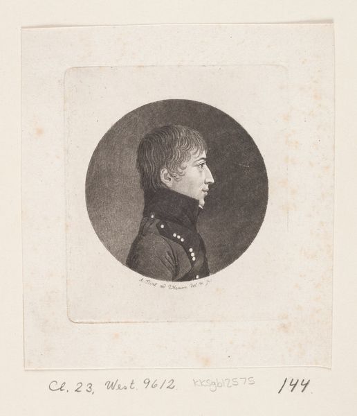 Curator: Immediately striking is this circle encapsulating a rather severe-looking gentleman. The engraving offers us a glimpse of Jonas Collett, whose life spanned 1767 to 1824. Editor: There’s a stern quality to it. Almost a…prideful stoicism in that sharp profile. That severe expression coupled with the precise line work gives off a real neoclassical vibe, a time obsessed with ideals and duty. Curator: Exactly! The use of engraving to create the image places him firmly within a particular artistic and socio-political context. This was a moment where print culture enabled the wide distribution of images, constructing and reinforcing societal values. Note his attire - it signifies status and professional position. Editor: His uniform tells us quite a bit. You see such symbolic weight in attire of the time. The precise details of his clothing speaks volumes, doesn’t it? The decoration is so clear and refined. It evokes a sense of control and order, which echoes larger cultural trends in the late 18th century. It is more about order and classification as ways to define what power actually is. Curator: Indeed, but don't you also see it as a signifier that links back to family honor and ancestral memory. The precision and detail can almost be understood as talismans to transmit ideals over generations? The visual rhetoric constructs meaning by connecting individual portraits to grander cultural narratives. Editor: An interesting thought. While that perspective might have some truth, I tend to think of these works less about idealized continuity and more about self-representation during eras of revolution. An effort to control narrative when the status quo begins to look insecure. How interesting it can be! Curator: Fascinating—a moment of intense scrutiny captured through art and print. A representation charged with the anxieties and aspirations of the day. It goes to show just how art becomes deeply entangled with cultural identity and the narratives we tell ourselves, doesn’t it? Editor: It is quite amazing how much we can still pull from these older pieces to view more clearly the ever persistent human endeavor toward representation and reinterpretation.