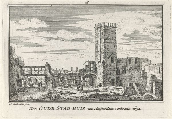 This is Abraham Rademaker’s "View of the Bijlhouwer Tower in Utrecht", created around 1660. Notice how the composition draws your eye immediately upwards. The stark, vertical thrust of the tower dominates the scene. Rademaker uses line and form to establish a hierarchy within the landscape. See how the detailed hatching and cross-hatching on the tower create a sense of monumentality, contrasting with the simpler, more loosely defined shapes of the surrounding buildings. This isn't just a record of a place; it's an essay on the relationships between permanence and transience, structure and formlessness. The tower, solid and enduring, stands in contrast to the more ephemeral and temporary structures around it. Rademaker uses the contrast between the detailed depiction of the tower and the softer rendering of the surroundings to suggest a meditation on time and history. The image destabilizes our perception of space and architectural representation. Consider how the verticality of the tower, emphasized by Rademaker's detailed linework, functions as a visual signifier of power and longevity, an assertion of human presence against the passage of time.