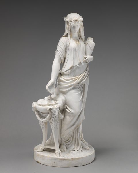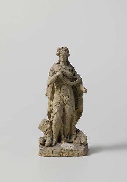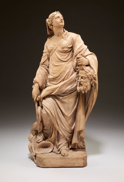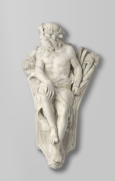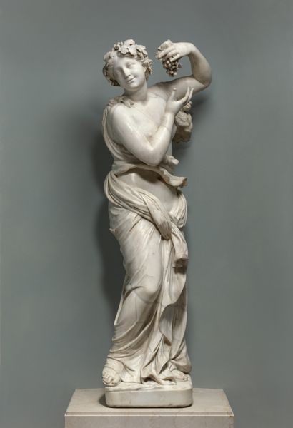 Editor: Here we have Pietro Bernini’s marble sculpture, "Autumn in the Guise of Priapus," created around 1616. It's hard to miss the overflowing basket of fruit he’s holding, and those rather striking feet at the base. What fascinates me most is the theatricality – this figure is making a statement. How do you interpret its presence within the art world of its time? Curator: It's crucial to consider Bernini's patronage and audience. Think about who would have commissioned such a work, and where it would have been displayed. "Autumn" is not simply a decorative piece, but one loaded with symbolic and political intent. Priapus, the god of fertility, is cleverly recast as Autumn, aligning the abundance of the season with concepts of power and prosperity. What effect do you think its display would have on viewers during that period? Editor: I see. So, beyond just appreciating its beauty, viewers were perhaps meant to draw parallels between the depicted abundance and the patron's own perceived authority and generosity? Almost like visual propaganda? Curator: Precisely. It's a calculated performance. Notice, too, the classical realism combined with the dramatic flair of the Baroque style. Bernini deliberately invoked classical precedents, thereby associating his patron with the grandeur of the Roman Empire. How does that marriage of styles speak to the public role of art during this era? Editor: It becomes clear that the artist isn't merely representing Autumn, but actively constructing an image intended to bolster the social and political standing of the commissioner. I hadn't considered the active role that sculpture had. Thanks! Curator: Reflecting on "Autumn," it's exciting to uncover the complex interplay of artistic skill, political maneuvering, and societal values embedded within seemingly straightforward depictions. A valuable lesson.