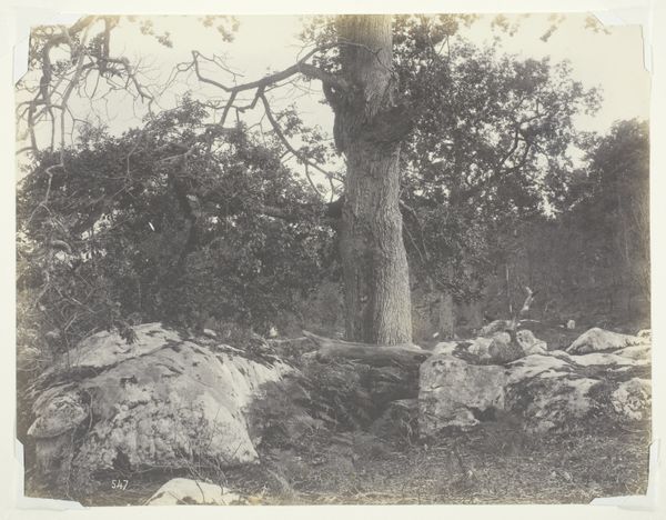 Editor: Gustave Le Gray’s “Oak Tree and Rocks, Forest of Fontainebleau,” created between 1849 and 1852, presents this almost monochromatic scene. I find it rather brooding, filled with the textures of bark and stone. What strikes you when you look at this photograph? Curator: I see a powerful dialogue between permanence and fragility. The oak, a long-standing symbol of strength and endurance across many cultures, is juxtaposed with the transient nature implied by the dappled light and shadow. It evokes a meditation on time and our place within it. What do you think the lichen clinging to the rocks and tree bark might signify? Editor: Perhaps it's about the coexistence of life and decay? A kind of visual reminder of nature's cycle? Curator: Precisely! And consider the forest itself. Historically, forests are places of myth, mystery, and transformation. By framing the oak within this setting, Le Gray taps into that deep cultural memory. What emotions does this contrast—between a symbol of permanence and a setting of impermanence—evoke in you? Editor: It creates a feeling of wistful contemplation. A sense that even the most solid things are subject to the passage of time. Curator: That's beautifully observed. The photograph doesn’t just record a scene; it invites reflection on mortality and resilience, drawing on our shared understanding of these natural symbols. I learned that photographic methods allow artists to play with perception. Editor: Absolutely, and the photograph itself becomes a symbolic object. I see the landscape in a richer way now.