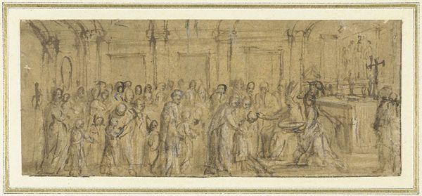 Curator: Here we have Anne-Louis Girodet’s “Scene from the Last Act of Corneille’s Rodogune,” dating back to 1800. It’s a pencil and colored pencil drawing, a preparatory sketch for a larger painting that captures a climactic moment from the tragic play. Editor: My initial impression is one of tension. There's a dramatic tableau of figures caught mid-action, their postures and gestures communicating a sense of conflict and impending doom. Curator: Girodet was deeply invested in Neoclassicism, which sought to revive the artistic ideals of ancient Greece and Rome. Historical and literary subjects became popular within the salons of the time, as they offered an educational lens to address the present through historical comparisons. "Rodogune," by the famous tragedian Pierre Corneille, portrays familial intrigue and ruthless power struggles in a royal family of ancient Syria. Editor: Visually, the image seems dominated by sharp angles, like those formed by the soldiers’ spears. The woman holding out what looks to be a chalice or a cup radiates a symbolic threat. This piece resonates with archetypal themes of betrayal, poison, and manipulation that one could say are common visual representations of the fall of monarchies and other systems of power. Curator: That's a fascinating interpretation, thinking about monarchies as a visual trope. Girodet was a student of Jacques-Louis David, and like his teacher, his artistic career developed during the French Revolution, with images being used in specific ways to represent certain values. He, too, went on to produce propagandist works of art. Therefore, it's not hard to assume that this work has underlying allegories. This preparatory drawing certainly embodies Neoclassical ideals, doesn't it? Clear, legible figures, theatrical lighting... Editor: Yes, absolutely, one can see his allegiance to the artistic trends. It's fascinating how the figures seem almost frozen. Girodet freezes this tragic moment and the moment before fate reveals itself to these figures. Even in the absence of color, it conveys such emotional depth. Curator: Looking at this today allows one to trace the different purposes images serve in political turmoil. In a way, this image’s original social intention differs vastly from its use in today's political climate, thus opening the possibility for the symbol of struggle and social turmoil to become abstracted in itself. Editor: Yes, symbols adapt and change over time, taking on new layers of meaning with each interpretation and cultural shift. Looking at "Scene from the Last Act of Corneille’s Rodogune" shows us just how resonant visual language can be, across centuries and contexts.