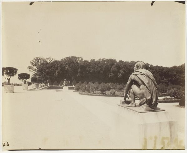 This photograph of the Fontaine du Point du Jour, was taken by Eugène Atget in Versailles. He worked with a large format camera and glass plate negatives, a method that required patience and technical skill. Notice how Atget’s choice of sepia-toned gelatin silver printing influences the appearance of the photograph. The warm hue emphasizes the textural contrast between the smooth stone and the rugged bronze sculpture. The sculpture itself, depicting a tiger wrestling a bear, is rendered with remarkable clarity and depth. Atget documented not just the object, but the labor and artistry embedded within it. The intense labor involved in quarrying, transporting, carving, and constructing such a monumental piece reflects the opulence and power associated with Versailles. By focusing on the physicality and the material presence of the sculpture, Atget’s photograph bridges the gap between fine art and craft. The photograph reminds us of the social context that shaped the sculpture's creation.