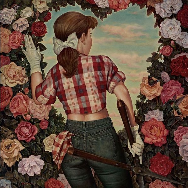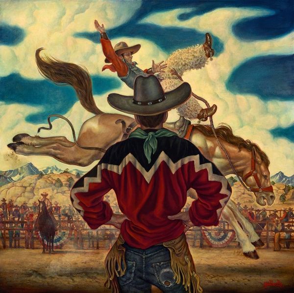Curator: Here we have Danny Galieote's oil painting, "Finders Keepers." Immediately striking, isn’t it? Editor: Indeed. The subject has an arresting gaze that complements the violence, yet the lighting creates a strange warmth despite the overt hostility of the composition. Curator: Let's situate this within its historical echoes. Genre painting has often been a way to engage with cultural norms. How does Galieote, do you think, grapple with established ideas of femininity through this character who embodies both danger and perhaps even a reclamation of power in a historically masculine space? Editor: I would suggest that the textures are quite important as well, and the careful arrangement of them throughout the plane. Note the rough fringe set against the glossy metal, for example, to highlight this tension between textures. Curator: Absolutely. What strikes me is the way she unsettles expectations. The almost fantastical rendering—especially of her form—plays into how women in positions of power have historically been represented in exaggerated, often sexualized ways to either demonize or fetishize them. But, through this depiction, Galieote may challenge such frameworks. Editor: And, returning to form, this brings the eye around to see the interplay of cool versus warm palettes at play; for example, a sharp contrast can be perceived between the coolness of the desert background to the figure who, despite brandishing firearms, embodies more 'feminine' notions in dress and pose. Curator: I find the details really compelling: The somewhat theatrical costume speaks to an almost constructed sense of identity, playing into notions of performance and perhaps even resistance. This piece serves as a really fertile ground to examine the relationship between art, identity, and societal power structures. Editor: Yes, an artwork of significant form and compelling arrangements, but additionally so as one moves beyond what's easily apparent in subject, color and light.