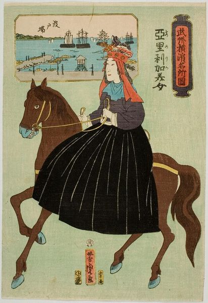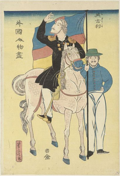 Editor: Here we have Utagawa Yoshikazu's "Englishman," a woodblock print showing a British figure on horseback with a flag bearer. The figures seem a bit…caricatured. What can you tell me about the context of this image? Curator: This print reflects Japan’s engagement with the West during the late Edo period. These depictions weren’t always accurate, embodying anxieties around foreign influence. How does this image reinforce or challenge Western perceptions of power? Editor: I guess it's showing Japan’s view of the West, more than an actual Westerner. Curator: Precisely. Consider how the artist uses visual cues, like the flag and clothing, to construct a narrative about identity and cultural exchange. What does this tell us about Japan’s understanding of its place in a changing world? Editor: It’s like Japan is trying to figure out how it fits in with these new global powers. Curator: Exactly. The artist highlights the social dynamics at play during a period of intense cultural negotiation. Editor: That's fascinating; it's a lot more complex than I initially thought. Curator: Indeed. By analyzing these prints, we can gain insight into the power dynamics of the time.