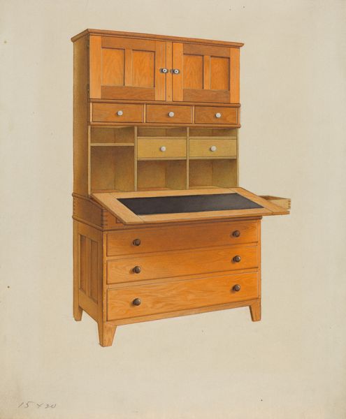 This “Shaker Cabinet” was made by John W. Kelleher, sometime between 1855 and 1995, we don’t know the exact date, using watercolour, graphite, and coloured pencil. The palette is like a sun-bleached wood – a harmony of tans and oranges that bring an appealing warmth to the piece. What I love about this piece is how it highlights the beauty of simple form. The lines are so clean, almost architectural, and the artist really pays attention to the surface of the wood. You can almost feel the grain, the texture, and the smoothness of the cabinet. The subtle shadows cast by the small doorknobs and edges create depth and emphasize the physicality of the object. This piece reminds me of Agnes Martin, another artist who found profound depth in simplicity, who often used the grid and subtle colour to create meditative spaces. Artmaking is a conversation across time, and each piece invites us to see the world a little differently.