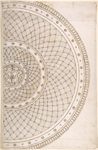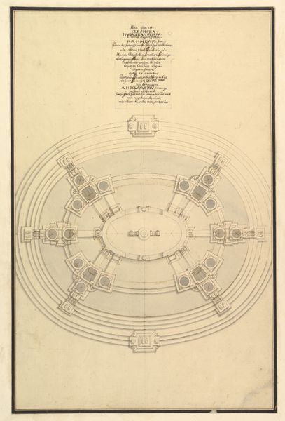 Editor: This is a pamphlet on sundials, "Conus Solaris concavus," by Georg Brentel the Younger. It's a fascinating print with intricate lines and ornamental flourishes. What catches your eye from a purely formal perspective? Curator: The graphic elements assert themselves immediately. Note the interplay between the geometric precision of the sundial grid and the organic curves of the decorative borders. The choice of a singular reddish-brown ink unifies the composition, creating a harmonious visual field despite the complexity of the design. Editor: That's interesting. So you see the unity in the contrasting elements because of the color choice? Curator: Precisely. The subtle tonal variations within the print add depth, preventing it from becoming overly rigid. Consider also the visual weight distribution; the densely ornamented edges counterbalance the open space within the sundial's arc. Did you observe the empty space, or field, as contributing to the artwork's composition? Editor: Yes! I am noticing that now. Thanks for pointing that out.