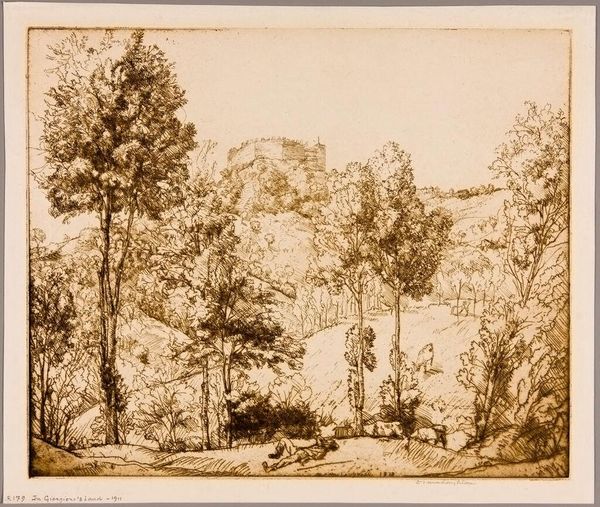 Editor: This is Donald Shaw MacLaughlan's "Olive Groves". It's a striking etching, and the use of line creates such a sense of depth. How does its historical context inform the way we see it today? Curator: Consider the late 19th, early 20th century. Etchings like this gained popularity due to their reproducibility, making art accessible. How does this relate to the democratization of landscapes in art? Editor: So, was it about bringing the countryside to the city dweller? Curator: Precisely! It’s about constructing and marketing an image of the rural. Notice how it evokes a picturesque, almost romantic, view. Who was this art made for, and what was its purpose? Editor: I see what you mean. Thanks! It's interesting to think about who got to consume these idyllic scenes. Curator: Indeed, and the social implications of that consumption. It gives you a different perspective, doesn't it?