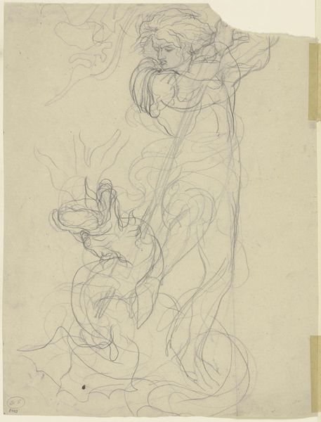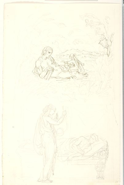 Editor: So here we have C.G. Kratzenstein Stub’s pencil and etching, "Fingal med Agandecca. To forskellige udkast til samme kompostion", created between 1810 and 1816. It feels like a ghost story unfolding, all tentative lines and hazy figures. What exactly do you make of this ethereal scene? Curator: It's interesting, isn't it? Almost a whisper from the past. The pencil lines, so light, they’re barely there, like memories fading. See how he places Fingal in two separate studies on the page, experimenting, searching for the perfect way to capture this ancient tale. The figures huddle below, caught in the drama of it all. The romanticism bleeds from the historic content. Have you encountered Ossian before? Editor: I’ve read a bit about the Ossian cycle… some say it’s fabricated. A lot of argument over its authenticity, I gather. Curator: Exactly. And Stub steps right into that contested space, that fabricated feeling somehow liberating his artistry. You sense his freedom with those very open pencil marks, not unlike that very same scholarly freedom. He isn't bound by the historical weight; instead, the legend becomes a canvas for emotional exploration. See the shield—do you see a warrior? It’s almost as though he’s letting us see into his mind as he plans and re-plans this great work. Editor: So, it’s less about historical accuracy and more about…capturing a mood, a feeling? Curator: Precisely. He's chasing after the romantic ideal, that raw, untamed emotionality. Imagine him, hunched over this page, wrestling with the composition, the story… He wants to make Fingal into more than just words or legends, I reckon. Editor: It does make me see it differently. I was so focused on trying to decipher the story within the sketch itself; the historical intent makes sense. Now the process seems the actual point. Curator: Exactly! And sometimes, isn't the journey of creation more captivating than the final destination? I see process and romantic aspiration.