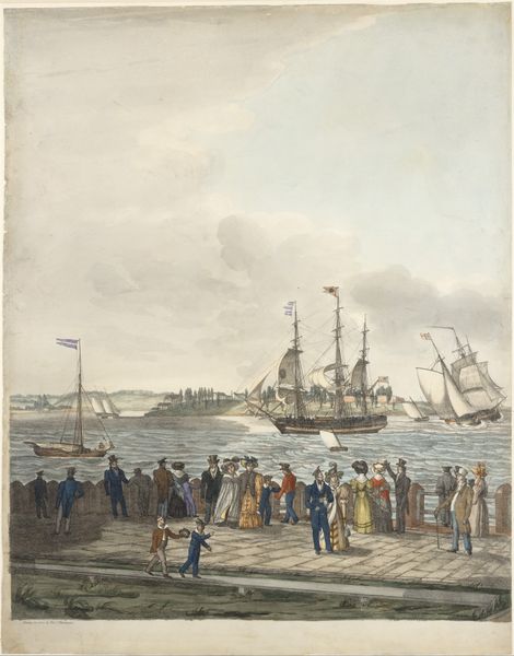 Curator: Let’s turn our attention to this 1689 engraving currently housed here at the Rijksmuseum, “Willem III vertrekt met de vloot naar Engeland, 1688”—or, William III Departs with the Fleet to England, 1688. It’s by an anonymous artist and captures a rather momentous occasion. Editor: It's certainly busy! So many lines and figures; it evokes a sense of bustling activity, like looking into a teeming anthill, even through the visual constraints of this black-and-white print. Curator: Observe the composition, if you will. The artist uses a high vantage point, compressing a vast fleet and thronging crowd into a relatively small picture plane. Notice how the lines direct the eye from the foreground revelry toward the ships on the horizon. The depth and receding scale certainly gives this flat engraving dynamism. Editor: Absolutely. It’s interesting to view this through a postcolonial lens, though. William's departure, or rather, invasion of England, was seen as a monumental moment of liberation by some. But the engraving downplays the cost to colonized nations of European squabbles for power and dominion across the globe. Curator: Your perspective highlights how visual culture reinforces particular narratives. What strikes me are the textural details achieved with simple etched lines. The clouds are rendered as delicately as the agitated sea or the flags. There's an impressive uniformity of visual language. Editor: Agreed, though let's also not overlook the faces in the foreground. The clear revelry in their body language underscores popular support, obscuring dissenting voices, women and colonized populations left out of the dominant narrative of a male saviour claiming his throne. This heroic rendering of a pivotal historical moment warrants interrogation and critique. Curator: Well, our quick study highlights different ways to perceive and analyze such artwork! Both form and context, working in tandem, greatly enriches our visual experience and knowledge of the artwork. Editor: Indeed, to engage with it thoughtfully means not just admiring the artist's handiwork, but understanding the impact on countless lives erased and distorted by dominant viewpoints across time.