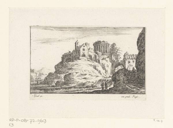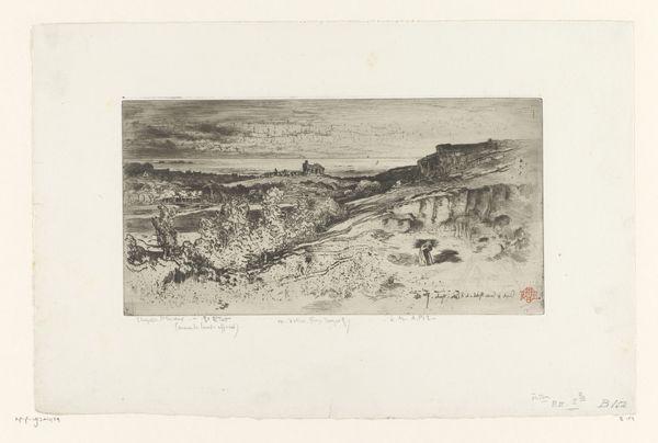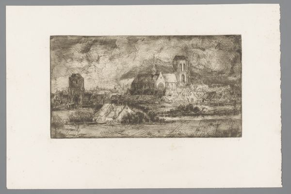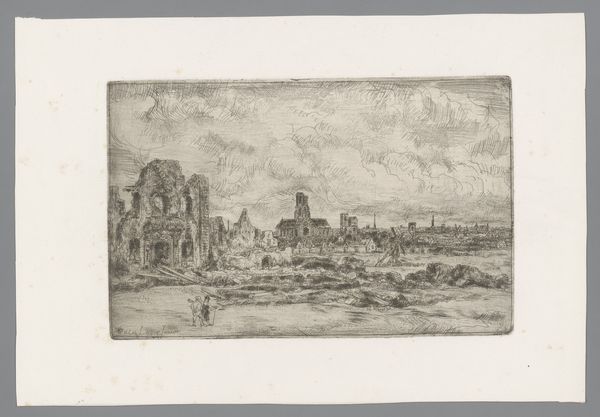 Curator: Willem Linnig the Younger created this etching titled "Kerkhof van Thuringen," sometime between 1876 and 1889. It’s part of the Rijksmuseum’s collection. Editor: My first impression is bleak, but compelling. It’s a graveyard scene rendered with incredibly fine lines; it's almost like a detailed pencil sketch rather than an etching. There's a figure, seemingly mourning, in the lower right. The mood feels somber and desolate. Curator: Indeed. Consider Linnig's mastery of the etching process, how he coaxes such intricate detail and tonal range from simple lines. What was it about this process that suited Linnig's style? Etching was often embraced as a readily reproducible medium which created commercial opportunities for artists to make money and disseminate imagery in this era. Editor: And let’s not forget the socio-political backdrop. This piece was created during a period of rapid industrialization and urbanization. How might those tumultuous changes have shaped Linnig’s vision of the landscape, and perhaps his interest in cemeteries? There’s a definite air of romanticizing ruins that speaks to broader anxieties about progress and loss. Curator: The print medium itself makes the artwork accessible to a wider audience. Rather than an oil on canvas confined to a wealthy collector's home, this image could circulate amongst different classes, prompting various engagements with death and mourning as commodities. The very act of creating prints alters how such weighty themes engage in the world. Editor: Absolutely. And consider the context of display – where was this piece exhibited, how was it received? The success of its original sale certainly reveals information on the contemporary viewer and their taste in relation to loss and devastation depicted here. Museums and galleries became essential sites for shaping public taste. Curator: It's fascinating to view the ways that Linnig exploits the potential for repeatable imagery. It highlights death's impact on the larger population beyond just individual mourning, it showcases shared societal grief and the human process of understanding loss. Editor: Yes, an intimate medium facilitating a wider discourse around profound experiences within a changing society. Thank you for sharing your insights on the social sphere involved with such a vulnerable print. Curator: Thank you for exploring this further with me through the materiality of this piece and its place within a society eager for more prints.