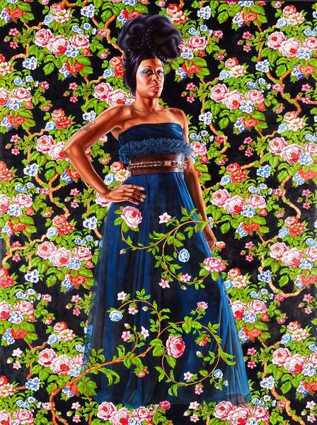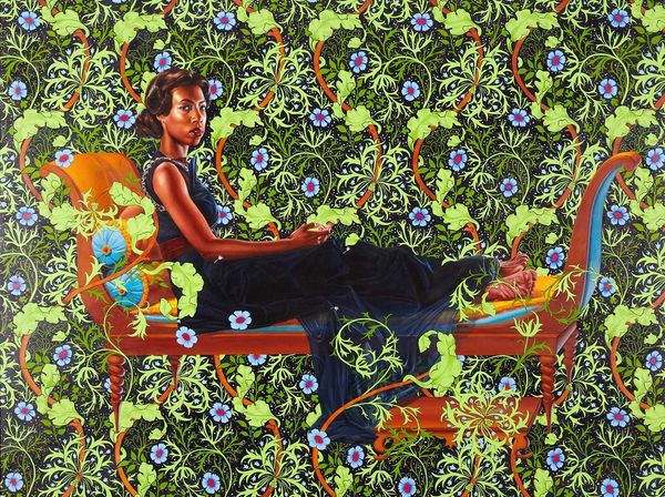 Editor: We are looking at "The Two Sisters," a 2012 mixed-media painting by Kehinde Wiley. I’m immediately struck by the juxtaposition of the figure and the ornate floral background; it's bold, almost a visual shout. How do you interpret this work? Curator: The visual shout, as you call it, is quite deliberate. Wiley engages with the history of portraiture, a space traditionally dominated by white Europeans, and reclaims it. He places Black figures, often sourced from the streets, into these grand, often romanticized settings. The floral background, reminiscent of William Morris's designs, serves as a symbol of Western luxury and power. Editor: So, it’s about power dynamics, taking control of art history? Curator: Exactly. By placing Black bodies in these historically exclusionary spaces, Wiley challenges the canon and asserts a presence. The "sisters," are they really sisters? Or, more broadly, does the title invite us to consider the bonds and shared experiences of Black women, centering them in a narrative from which they've often been excluded? The opulent details create a visual richness, but also prompts reflection on class, representation, and the gaze. How does her gaze impact your understanding of the piece? Editor: She’s looking back, almost defiant. Not just a passive object of beauty. Curator: Precisely! Her gaze disrupts the viewer’s power dynamic. It’s not just about *seeing* her, but about *being seen* by her. Wiley isn’t simply painting pretty pictures; he's engaging in a complex dialogue about race, gender, and the construction of identity. Editor: That's really insightful. I initially saw the surface beauty, but now I appreciate the deeper layers of meaning and the social commentary. Curator: Art is rarely just what meets the eye. Wiley compels us to question, to excavate the stories beneath the surface, and to confront uncomfortable truths about the world.