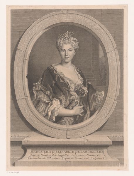 Curator: Here we have James McArdell's engraving from 1756, titled "Portret van een meisje met bilboquet," or "Portrait of a Girl with Bilboquet," housed right here in the Rijksmuseum. My first thought is the texture – how does it strike you? Editor: The engraving has such incredible softness; almost sculptural, considering its Rococo origin. The rendering of her silk dress makes me want to feel the fabric, it also speaks volumes about 18th-century textile production. Curator: Absolutely, observe how McArdell uses line and shadow to define volume, it directs our gaze across the frame—notice the delicate treatment of her lace collar against the solid shadow in the background. Editor: The fact that it is an engraving made me curious about the labor involved in the intaglio process, which suggests how luxury goods and artistic creation were intertwined at the time. Curator: A clever observation; furthermore, the girl's posture, frozen mid-game with her 'bilboquet', freezes her action, offering us access to an instant within this aristocratic life. The diagonals inherent in the game pull one’s eye upward through the portrait. Editor: Yes, and how might the child feel knowing her portrait reflects both personal skill and material affluence? It highlights class differences, and prompts thought about societal expectations that influenced young girls at the time. Curator: Consider, also, how McArdell captures her essence through compositional balance—how this artwork's harmony mirrors society’s attempt at order during this time. The slight asymmetry gives it vitality! Editor: By considering art's means of production, from material to labour, our understanding of art's history gains dimension. This deepens insight not only of period portraiture but of class division throughout art history. Curator: A poignant remark, and the level of craftsmanship invites us to reconsider our contemporary approaches of artistic value and aesthetics. Editor: I agree entirely; what has initially stood out to me now transcends beyond appreciation as texture. I feel compelled to question how art like McArdell's reflects a microcosm concerning labour and lifestyle—insights extending outward from material details.