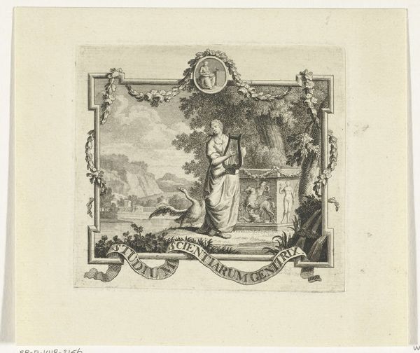 Curator: This etching by Daniel Nikolaus Chodowiecki, created around 1790, is entitled "Ridder vertelt kinderen over het vrijheidsverbond," or "Knight Tells Children About the Covenant of Freedom." It's currently held at the Rijksmuseum. Editor: There's a very interesting light quality to this print; almost an airy ethereal quality despite the subject matter of a knight addressing children. The framing device feels decidedly classical, almost like looking into a stage set. Curator: Absolutely. Let's consider Chodowiecki's likely process here. Etchings involve meticulous work—coating a plate with wax, scoring the design, and then using acid to bite into the metal. Each print is thus an impression of the labor embedded in its production. This work coincides with growing enlightenment ideals related to education. Editor: Precisely! The narrative scene within that structured border draws your eye to the arrangement of figures and the obelisk as an anchoring object in the image's composition. The knight gestures toward it as if explaining an abstract idea that's now grounded in materiality. It signifies something tangible—a commitment—reflected also in the knight's regalia. Curator: Right. What fascinates me is considering this print's purpose. Was it a single artistic statement, or mass-produced and widely available as printed ephemera to promote discussions on social reforms? How did its accessibility affect societal perceptions and the consumption of narratives around freedom? Editor: And how does the semiotics of dress play into that idea of freedom? The knight's gear reads clearly as a set of symbols denoting nobility and protection—juxtaposed with these bare-legged children whose very vulnerability enhances that noble purpose being telegraphed here. It establishes power dynamics through purely visual markers. Curator: Furthermore, we must look at this historical moment. How the print would be consumed considering Europe at the cusp of a new sociopolitical era—examining the influence of Enlightenment ideas—and in this piece a knight acts as its pedagogue. Editor: It’s an interesting detail to remember while examining how forms relate back and forth between art, the state and political power more broadly! Curator: Agreed. This piece reminds us how physical creation mirrors ideological creation. Editor: And how even an etched line embodies grand narratives.