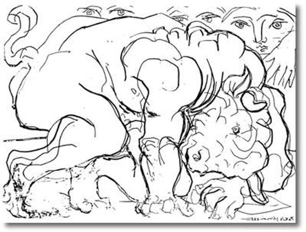 Eugène Delacroix rendered this ink drawing depicting two women sometime during his career. His oeuvre demonstrates an interest in literature and historical events, but also in human psychology and emotion. Here we see two women intertwined, one leaning solicitously over the other. Her concern is evident, and she appears to be cradling the other woman’s head in her lap. The woman on the ground is lying prone, her head resting on a pillow, her eyes are closed. Is she sleeping, resting, or could she be ill or injured? The scene’s intimacy suggests an emotional relationship between the two women, perhaps of friendship, sisterhood, or even something more. Delacroix was working during a time when gender roles were highly defined, and depictions of women were often idealized or placed within domestic settings. Delacroix often painted women in scenes of violence and vulnerability, yet here he suggests a connection between women that transcends the stereotypes of his time, depicting an affection that is palpable. The drawing leaves us wondering about the nature of their bond and the circumstances that brought them together.