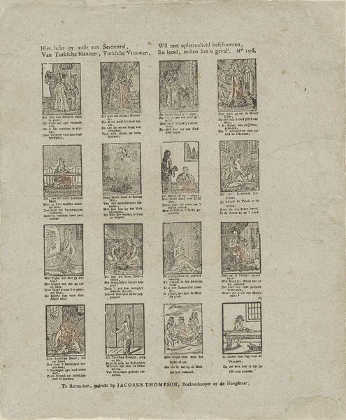 Curator: At first glance, this seems to tell a story through its sequential frames, reminiscent of early comics. There's something haunting in its simplicity. Editor: This is "Blauwbaard" a woodcut by Jan de (II) Lange, created sometime between 1822 and 1849. It’s part of the Rijksmuseum’s collection. Immediately, the repetitive form hints at mass production and a populist dissemination of the depicted subject, which appears to me as gruesome. Curator: Absolutely. "Blauwbaard," or Bluebeard, the character is instantly recognizable—a grim tale. The visual choices solidify the narrative and what Bluebeard represents. The print uses multiple frames in sequence, but in each one we find the same looming narrative and consistent villain figure in various forms: proposal, abduction, or in pursuit, with murder always nearby. Editor: And consider that as a woodcut, it involved a process requiring time, skill, and labor, challenging assumptions about what constitutes 'high art'. The materials used—the woodblock, the paper, the ink—are also revealing. Did the paper contain certain fibers, imparting characteristics in reception or legibility? Was the ink readily available or from an outside source? All clues as to how and why this print existed. It reminds me that this probably adorned the walls and cabinets of many homes during that time. Curator: And the colors – muted, almost unsettling, and of the era! The color choices lend an antique-like quality that also evoke a distinct feeling in the story of secrets and repressed truth, of the violence that unfolds. It acts as a social document that reveals cultural anxieties around marriage and gender. Editor: Indeed. This print is so evocative due to the method in which it could easily communicate warnings, a method of distribution, and a physical document, or residue, of an unfolding folk legend. This definitely gives you an entire historical feeling. Curator: The woodcut, far from just depicting the Bluebeard story, becomes part of its enduring symbolic weight. Thank you! Editor: Thank you, and a valuable exercise to ponder labor, symbolism, process and material to enrich our perception of the artwork.