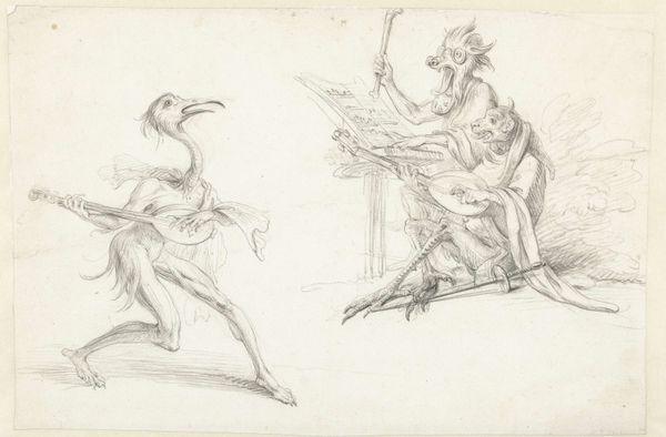 Editor: This is an 18th-century anatomical drawing from an anonymous artist at The Met. The contrast between the draped figure and the skeleton is so stark. It almost feels like a meditation on mortality and beauty, existing on the same plane. What catches your eye in this piece? Curator: You know, it's fascinating how academic art tackled the ephemeral! These figures aren’t just bones and fabric, are they? Look at the light. One seems to reach outwards; the other… well, rests, contemplates. Imagine the artist’s hand, learning how each form reflects light. Did they intend a memento mori? Probably, but I’m tickled by the little secrets of personality shining through those outlines. And you? How does it whisper to you? Editor: I see the echo of a single pose! Like they're dancing, or arguing... with each other, maybe? The drawing feels almost... performative? I didn't expect to find humor in anatomical studies. Curator: Exactly! And doesn't that juxtaposition make you ponder what's truly lasting? Flesh turns to memory; skeletal structure provides that framework... both beautiful in their own, decaying and permanent, ways. They remind us, perhaps cheekily, of the fleeting and the steadfast coexisting in every single, marvelous breath. What a cheeky sketch! Editor: So it's not just science, it's…poetry? I’ll definitely look at these diagrams differently from now on! Curator: See? Every line is a conversation. What began as dissection evolves into profound connections between life and form!